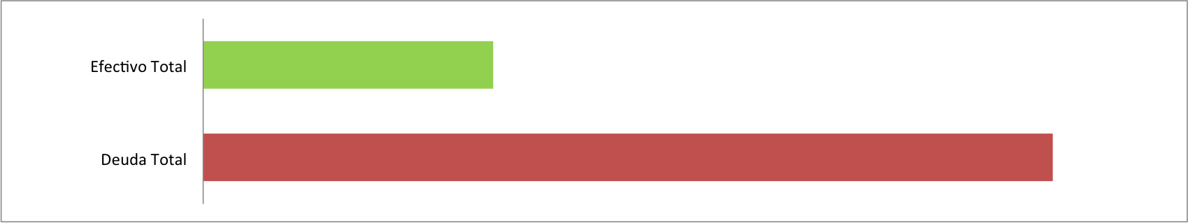 La gráfica que muestro a continuación, calcula el efectivo total que tengo en ahorro e inversiones de corto y mediano plazo, contra mi deuda total incluyendo créditos al consumo. OJO! Aquí no incluyo lo que tengo acumulado en mi AFORE ni en otro vehículo de inversión a largo plazo como puede ser un terreno, casa, departmento u otro activo no líquido.