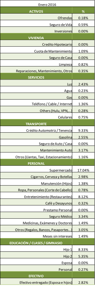 Nuestro gasto no ha ido tan mal la verdad. Aún y cuando Enero suele ser un mes pesado por el tema de tenencias y múltiples pagos que tenemos que hacer, hemos registrado un nivel de gasto bastante aceptable. Claro, los ingresos de éste mes nos ayudaron muchísimo y por ende terminamos con un poco de nuestro ingreso en la bolsa del ahorro.