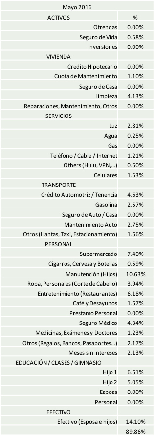 TIP: Mi gasto ideal (ahora) debe de andar rondando el 85% de mis ingresos pues con colegiaturas e inscripciones es difícil mantener abajo este indicador. Lo ideal sería un 70%. Si tú eres soltero(a), deberías de ser agresivo(a) y tratar de gastar menos del 50% de tus ingresos. Lo anterior te ayudará a lograr tu independencia financiera mucho más rápido. Pero como, lo importante es que tengas control sobre tus finanzas personales.