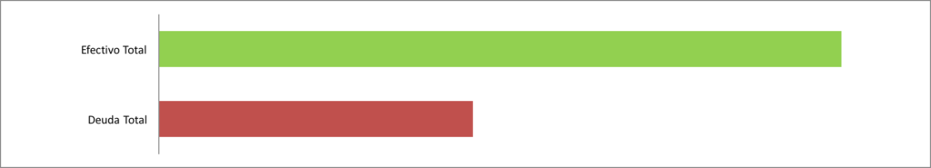 La gráfica que muestro a continuación calcula el efectivo total que tengo en ahorro e inversiones de corto y mediano plazo, contra mi deuda total incluyendo créditos al consumo. OJO! Aquí no incluyo lo que tengo acumulado en mi AFORE ni en otro vehículo de inversión a largo plazo.